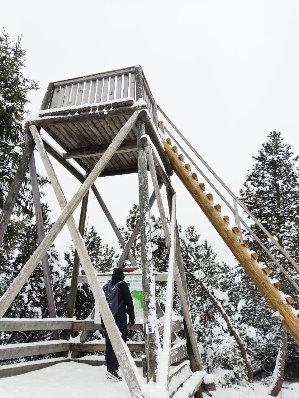 Es gibt einen Aussichtsturm auf circa halber Wegstrecke (Tannermoor Hochtstand), welchen wir jedoch nicht erklommen haben, da die Sprossen zum Turm vereist waren.