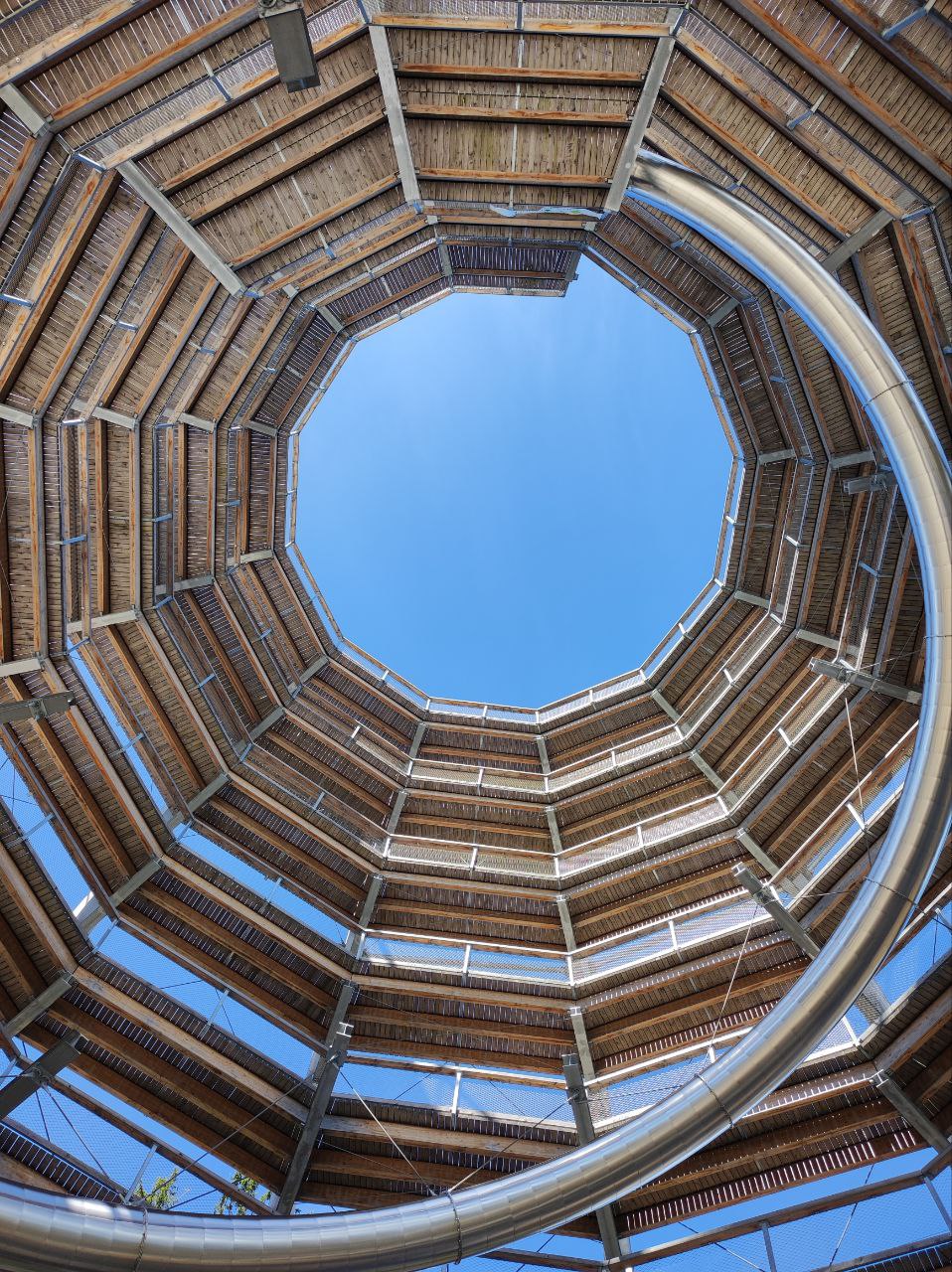 Kinder (und Erwachsene) ab 6 Jahren können abschließend die Abkürzung mit der Tunnelrutsche nach unten nehmen (nur bei gutem Wetter möglich).